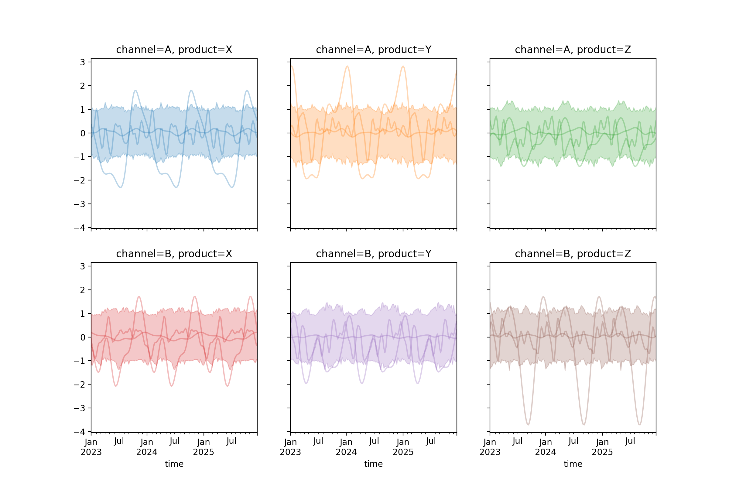 import numpy as np import pandas as pd import pymc as pm import matplotlib.pyplot as plt from pymc_marketing.mmm import HSGPPeriodic from pymc_extras.prior import Prior seed = sum(map(ord, "Higher dimensional HSGP with periodic data")) rng = np.random.default_rng(seed) n = 52 * 3 dates = pd.date_range("2023-01-01", periods=n, freq="W-MON") X = np.arange(n) scale = Prior("HalfNormal", sigma=1) ls = Prior("InverseGamma", alpha=2, beta=1) hsgp = HSGPPeriodic( X=X, scale=scale, ls=ls, m=20, cov_func="periodic", period=52, dims=("time", "channel", "product"), ) coords = { "time": dates, "channel": ["A", "B"], "product": ["X", "Y", "Z"], } prior = hsgp.sample_prior(coords=coords, random_seed=rng) curve = prior["f"] fig, axes = hsgp.plot_curve( curve, n_samples=3, random_seed=rng, subplot_kwargs={"figsize": (12, 8), "ncols": 3}, ) plt.show()