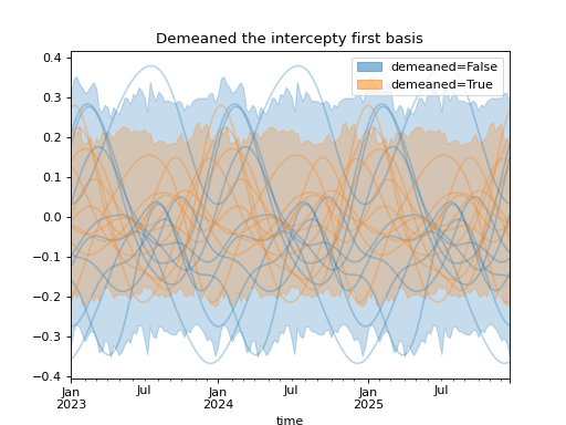 import numpy as np import pandas as pd import xarray as xr import matplotlib.pyplot as plt from pymc_marketing.mmm import HSGPPeriodic from pymc_marketing.plot import plot_curve seed = sum(map(ord, "Periodic GP")) rng = np.random.default_rng(seed) scale = 0.25 ls = 1 kwargs = dict(ls=ls, scale=scale, period=52, cov_func="periodic", dims="time", m=20) n = 52 * 3 dates = pd.date_range("2023-01-01", periods=n, freq="W-MON") X = np.arange(n) coords = {"time": dates} hsgp = HSGPPeriodic(demeaned_basis=False, **kwargs).register_data(X) hsgp_demeaned = HSGPPeriodic(demeaned_basis=True, **kwargs).register_data(X) def sample_curve(hsgp): return hsgp.sample_prior(coords=coords, random_seed=rng)["f"] non_demeaned = sample_curve(hsgp).rename("False") demeaned = sample_curve(hsgp_demeaned).rename("True") combined = xr.merge([non_demeaned, demeaned]).to_array("demeaned") _, axes = combined.pipe(plot_curve, "time", same_axes=True) axes[0].set(title="Demeaned the intercepty first basis") plt.show()