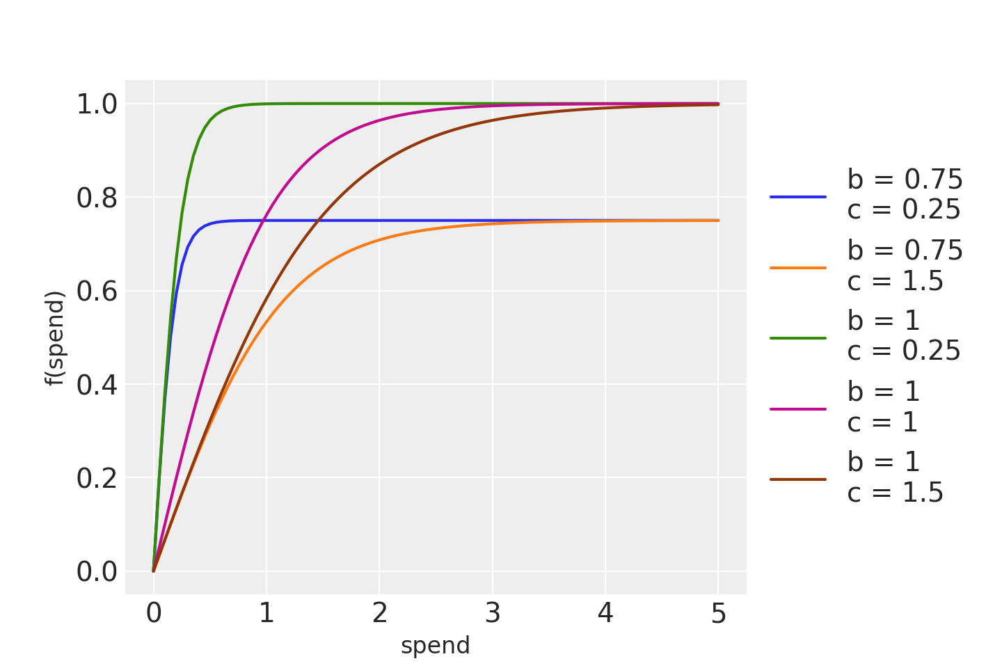 The tanh saturation function has a nice property that is useful when setting priors. The slope of the function when x is zero is \(\frac{1}{c}\). This means that you can set a prior by considering how many units of media are required to acquire the first customer. Unlike most other saturation functions, the slope at 0 is independent of the saturation point.
