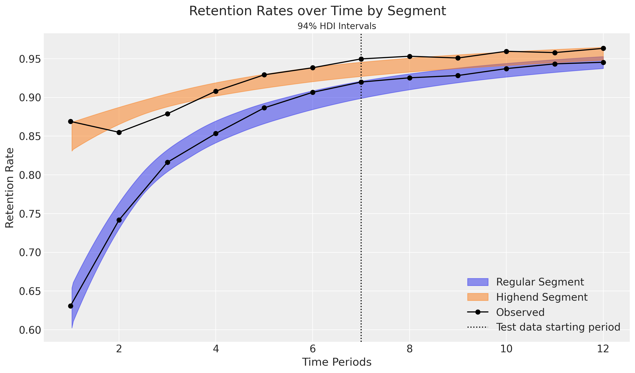 This dataset was generated from the first 8 time periods in Table 1 of the research paper, which provides survival rates for two types of customers (“Regular” and “Highend”) over 13 time periods: