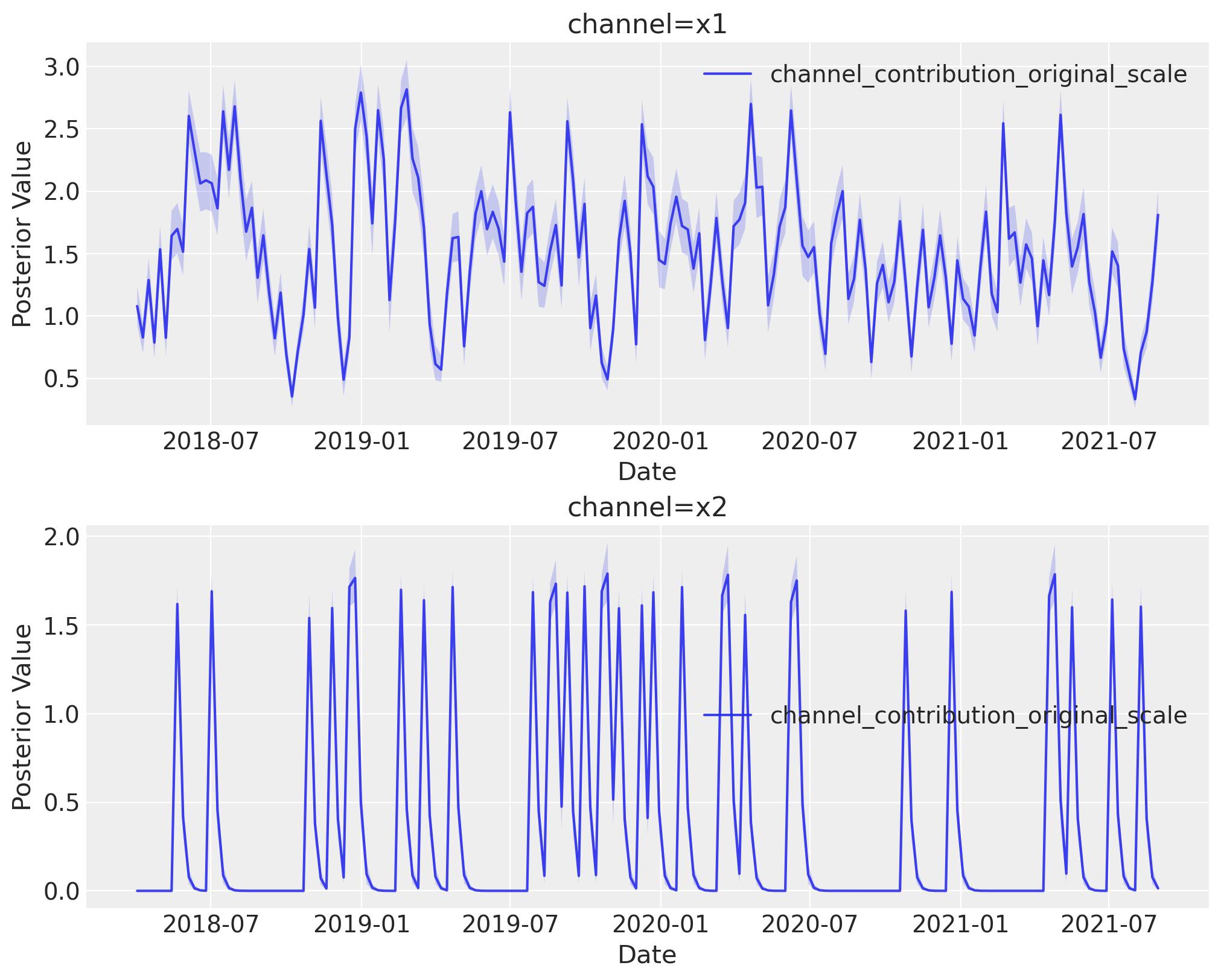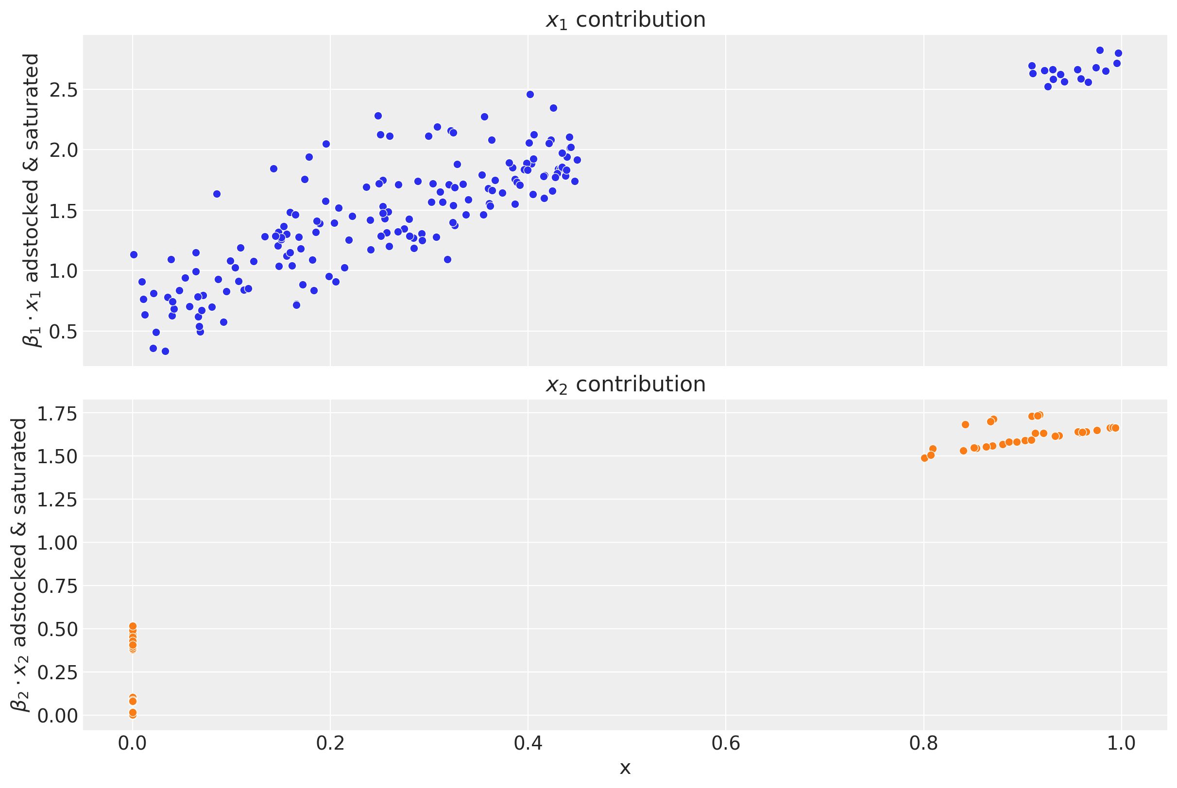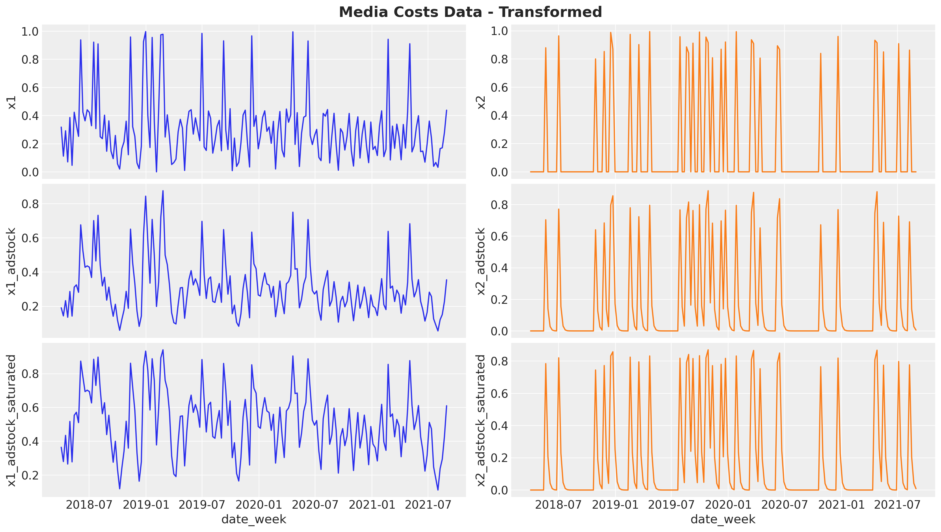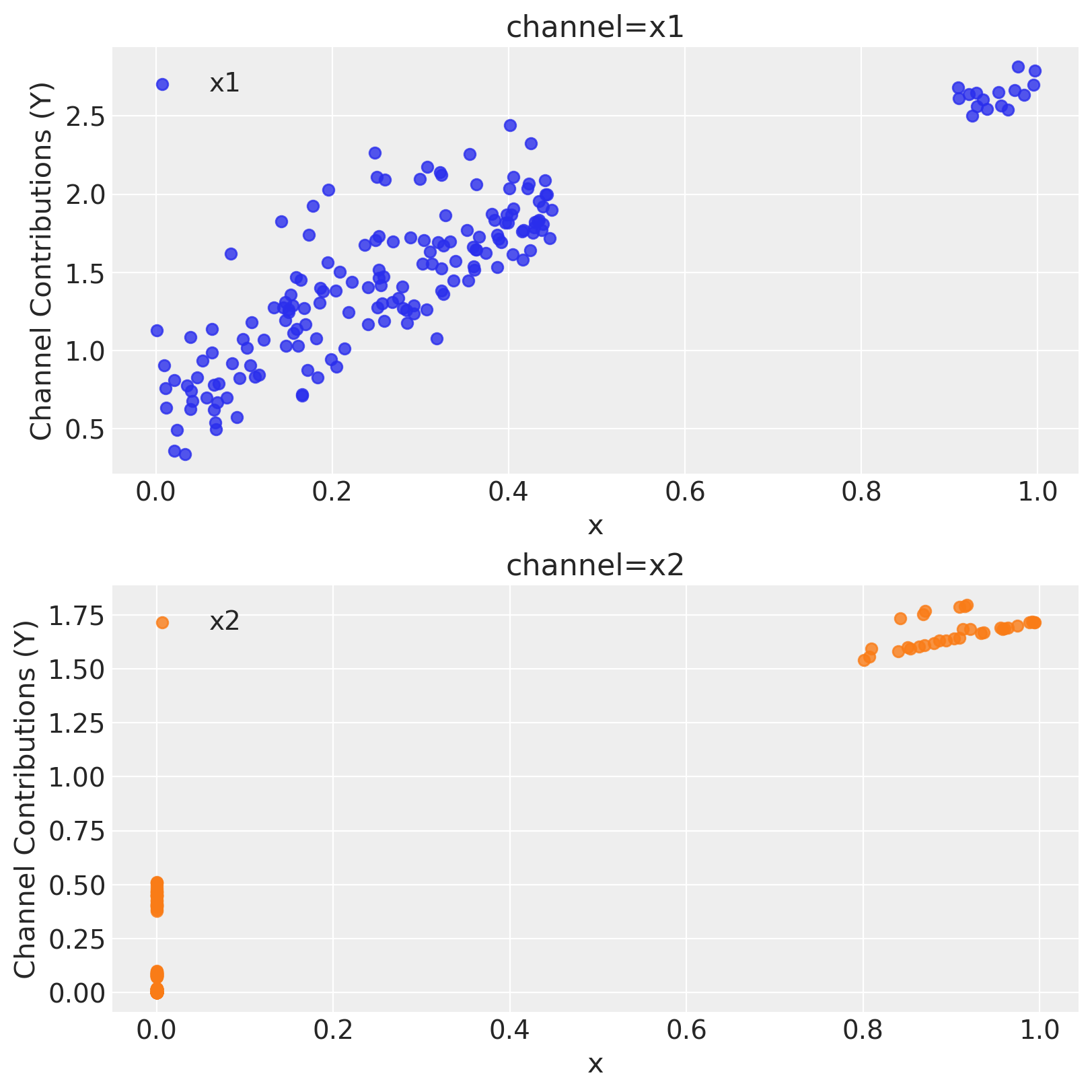 Remark: By design, \(x_{1}\) should resemble a typical paid social channel and \(x_{2}\) an offline (e.g. TV) spend time series.