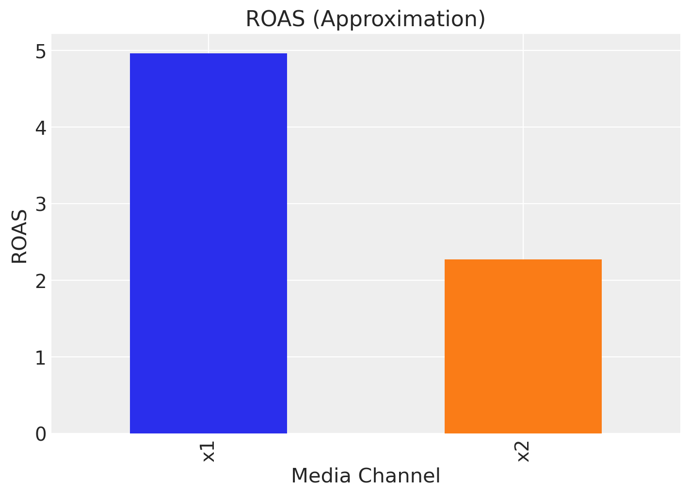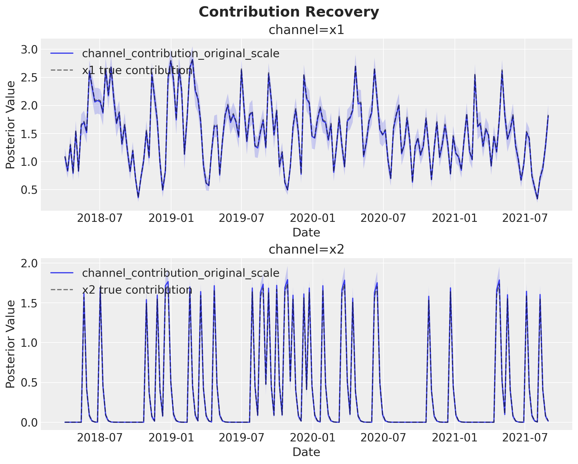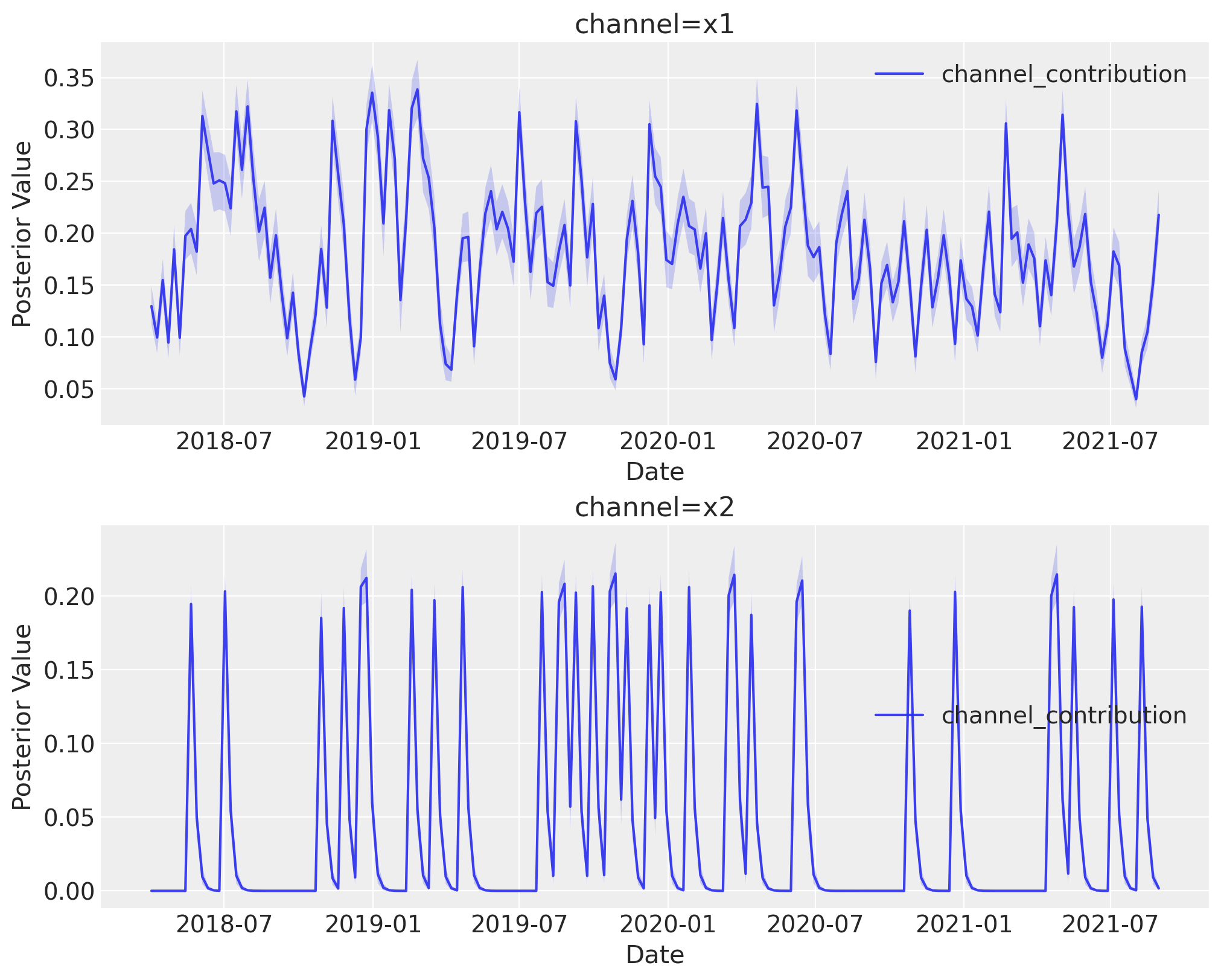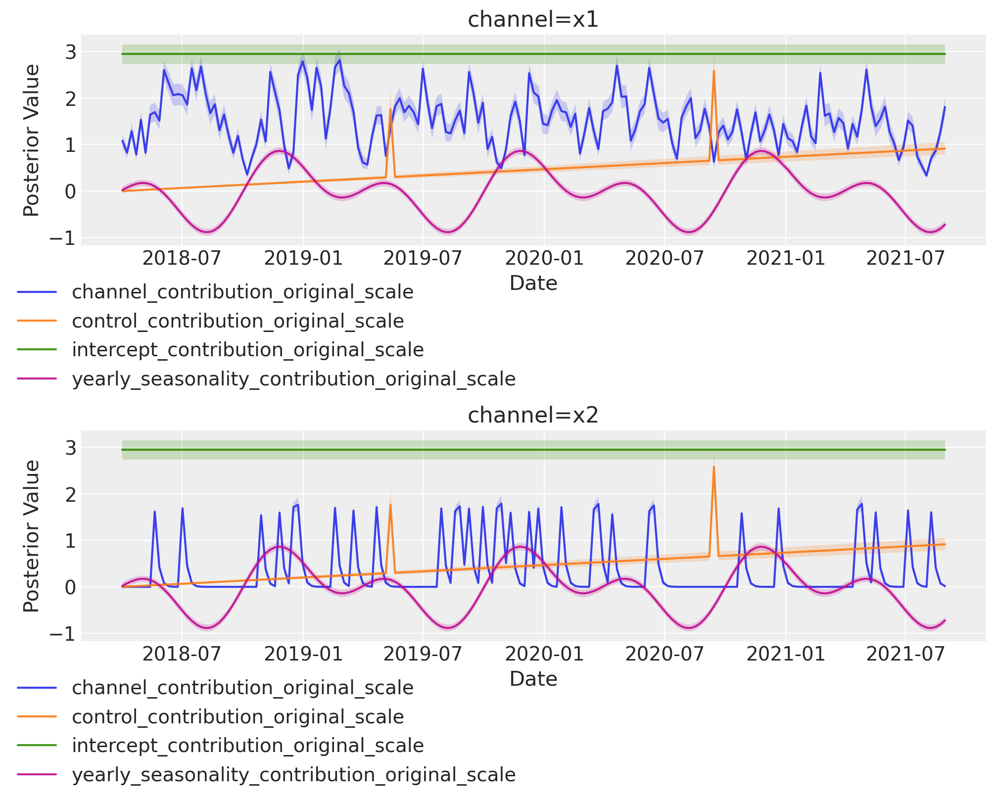 Remark: By design, \(x_{1}\) should resemble a typical paid social channel and \(x_{2}\) an offline (e.g. TV) spend time series.