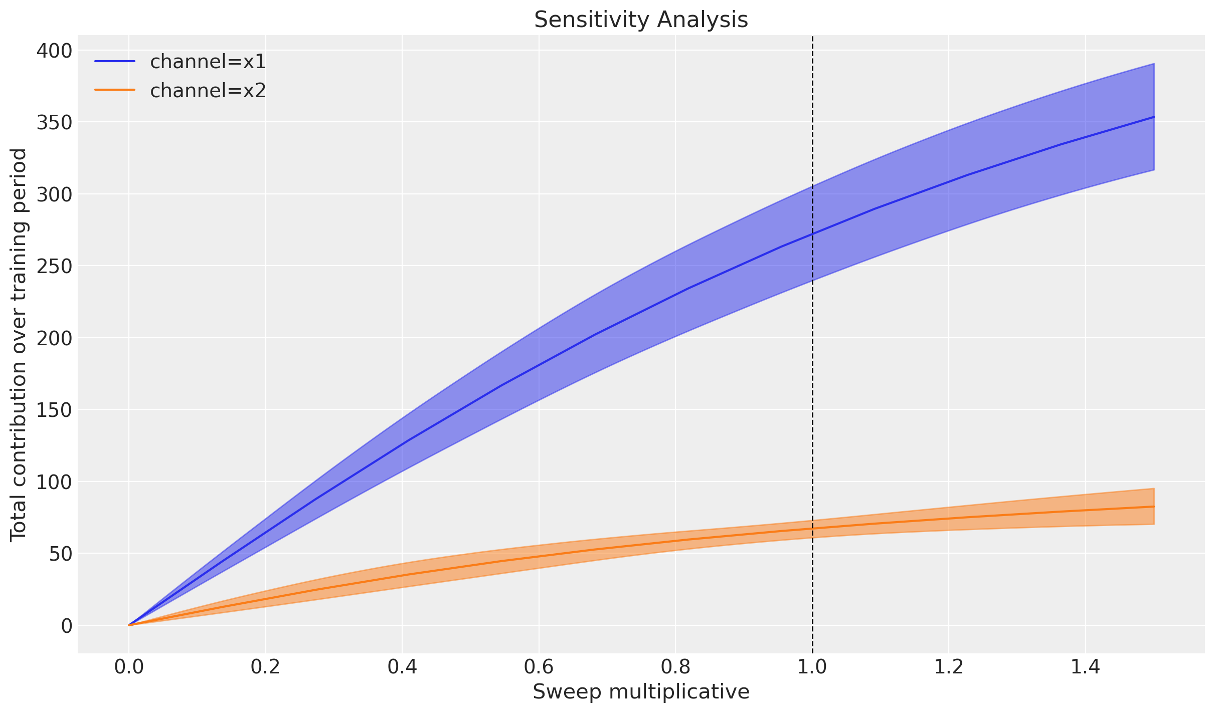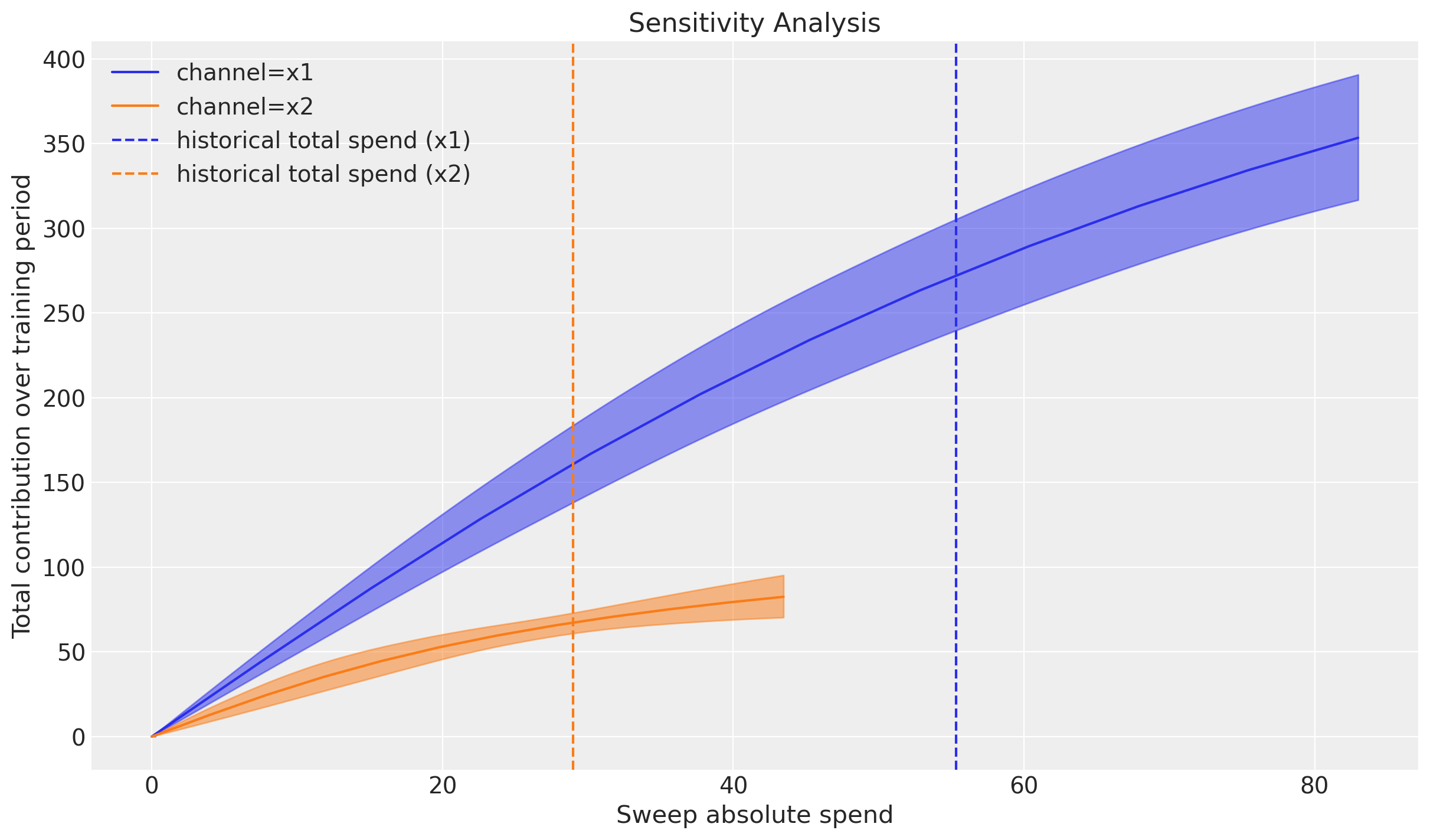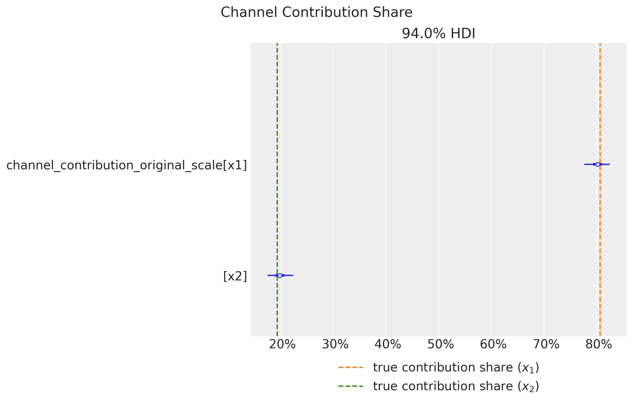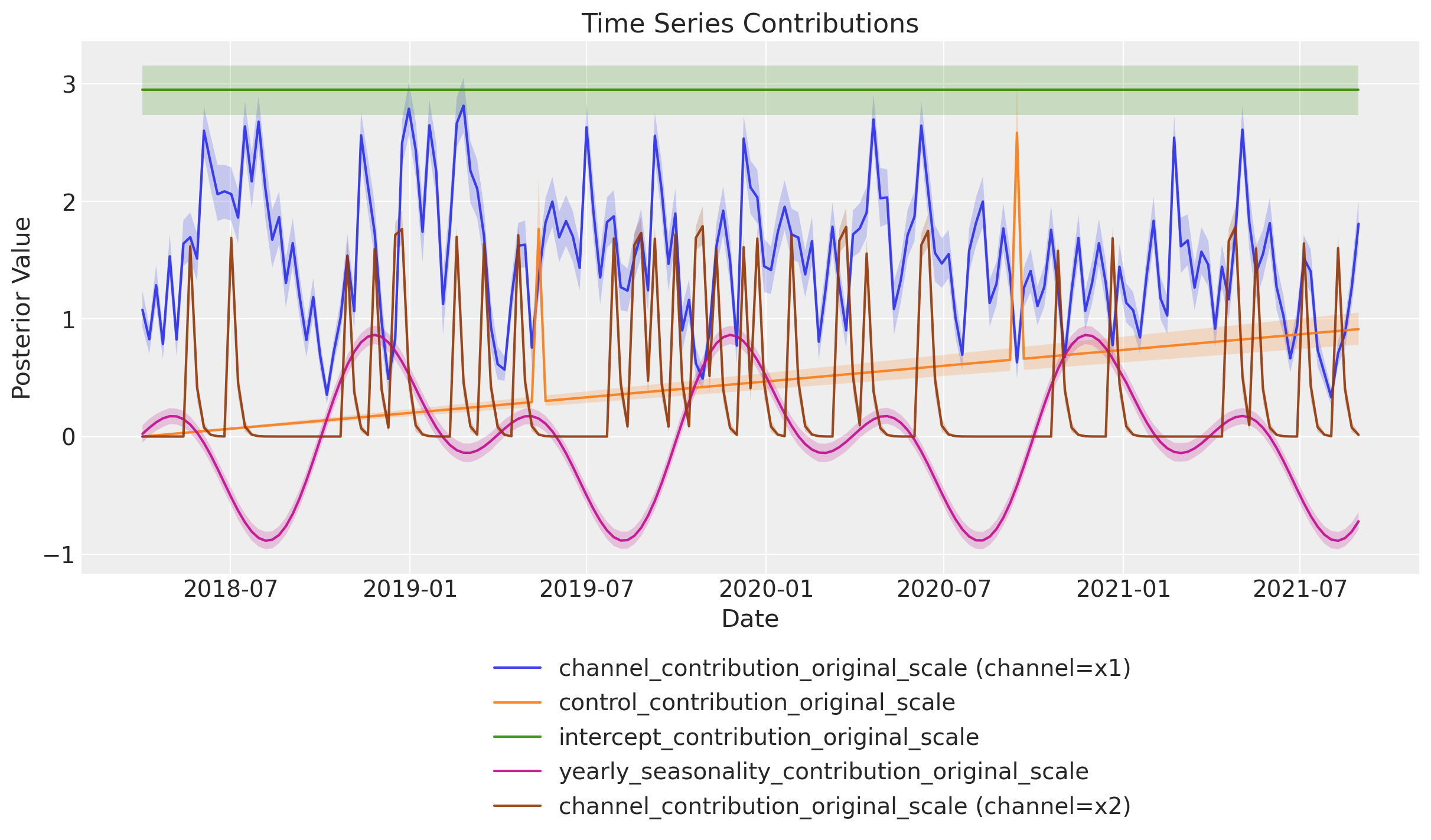 Remark: By design, \(x_{1}\) should resemble a typical paid social channel and \(x_{2}\) an offline (e.g. TV) spend time series.