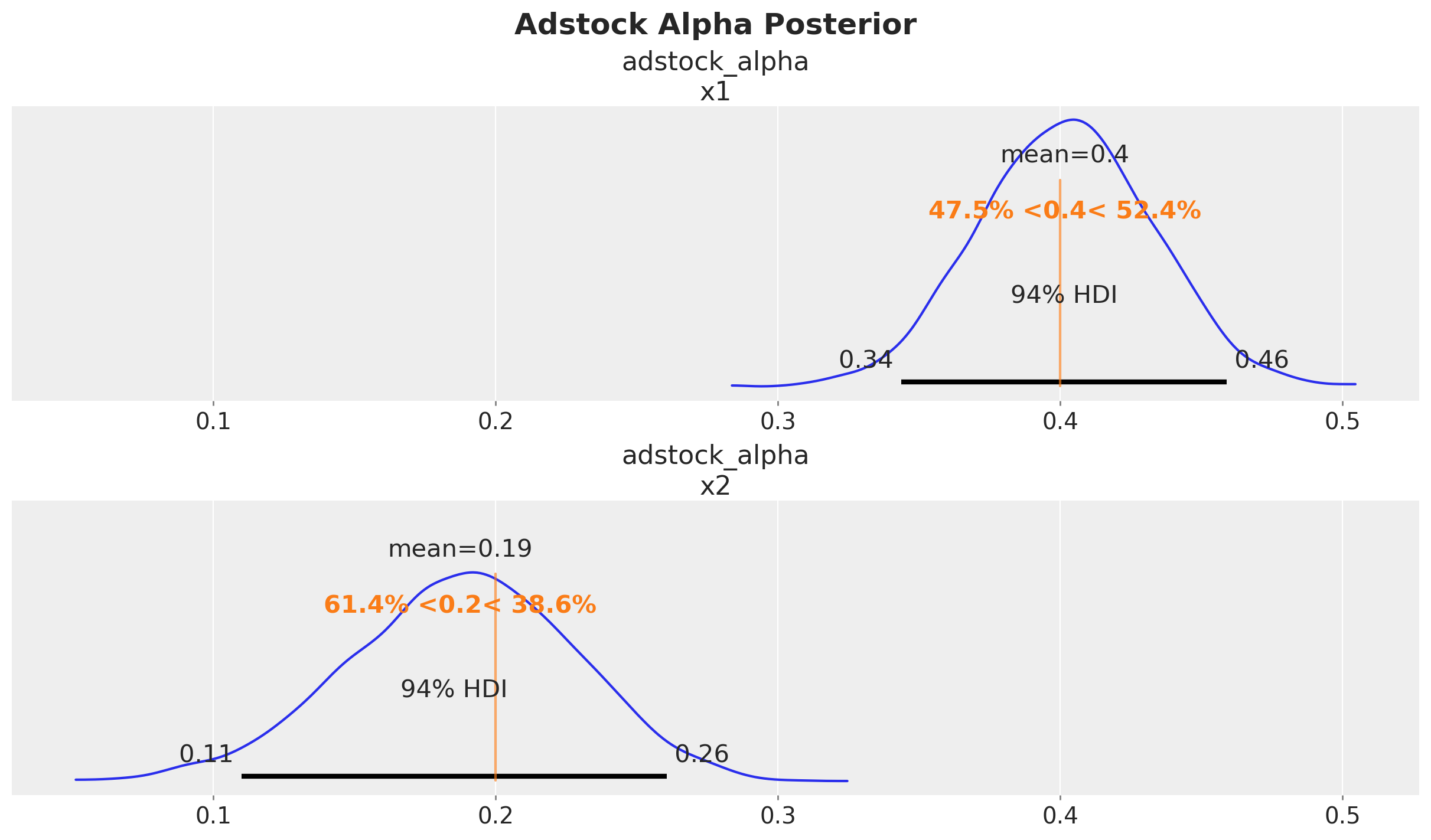 Let’s start with the adstock transformation. We set the adstock parameter \(0 < \alpha < 1\) to be \(0.4\) and \(0.2\) for \(x_1\) and \(x_2\) respectively. We set a maximum lag effect of \(8\) weeks.