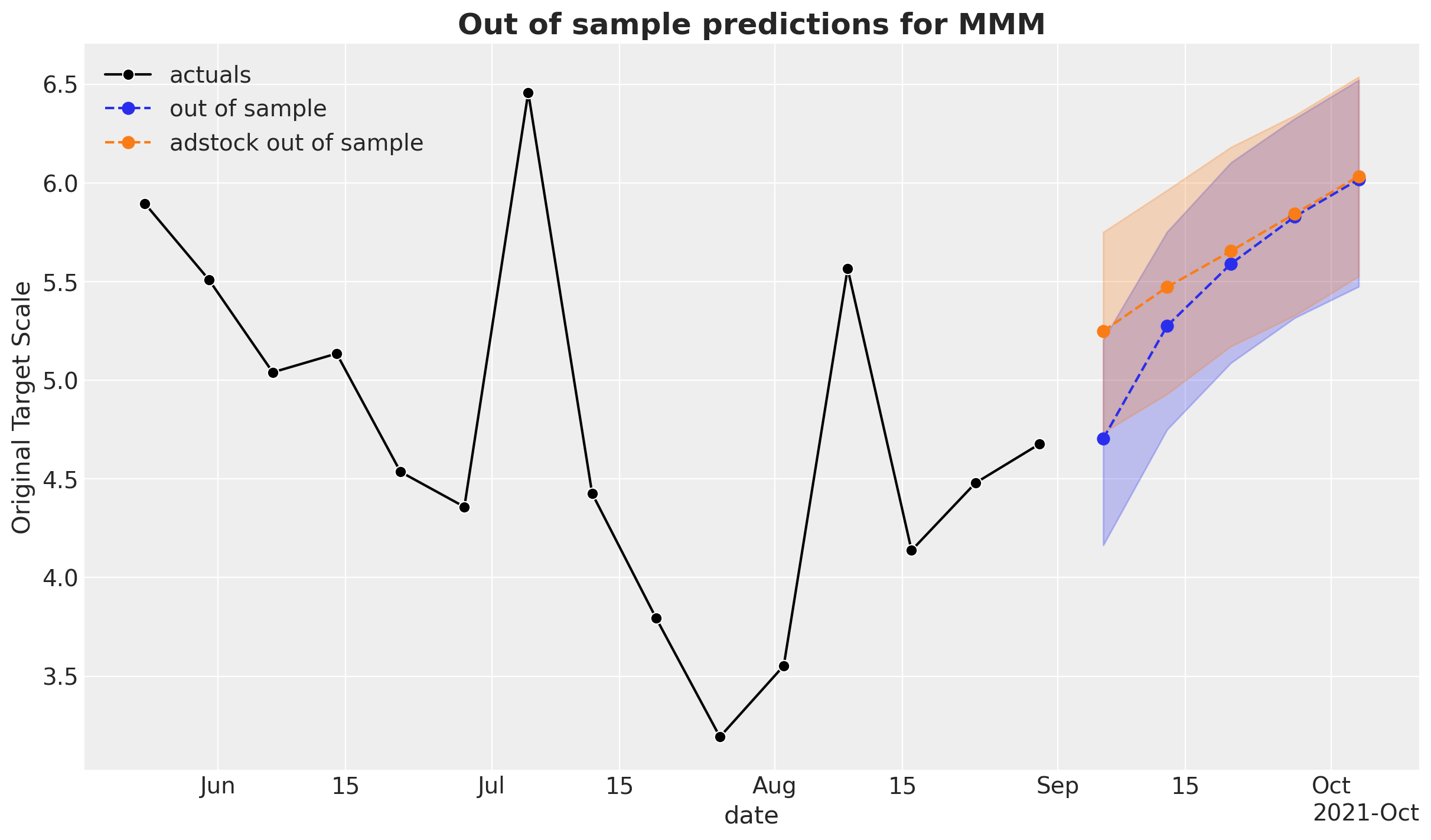 ax.set_title("Out of sample predictions for MMM", fontsize=18, fontweight="bold")