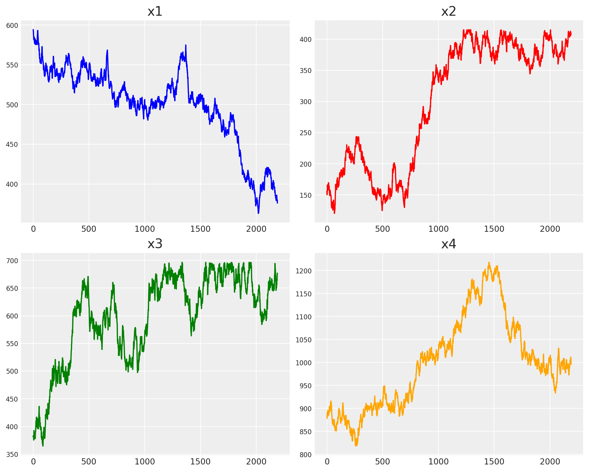 For the following examples, we won’t build a large structural process, since the goal of this notebook is simply to showcase the library’s capabilities. Instead, we’ll generate a few time series following random walks and define a simple linear target variable that depends on the number of created drivers.