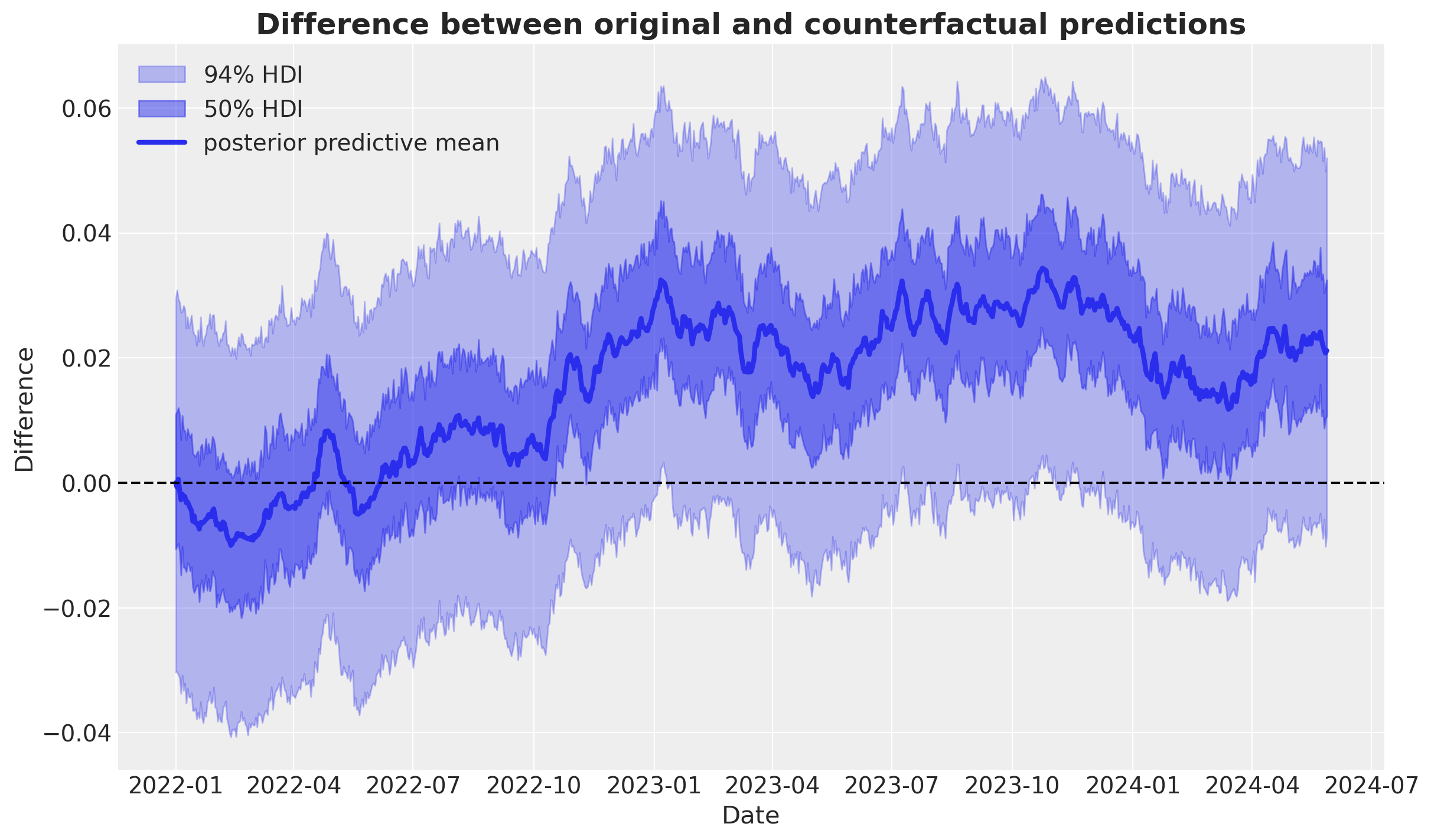 Finally, we can calculate the difference between the original and counterfactual predictions and visualize the results: