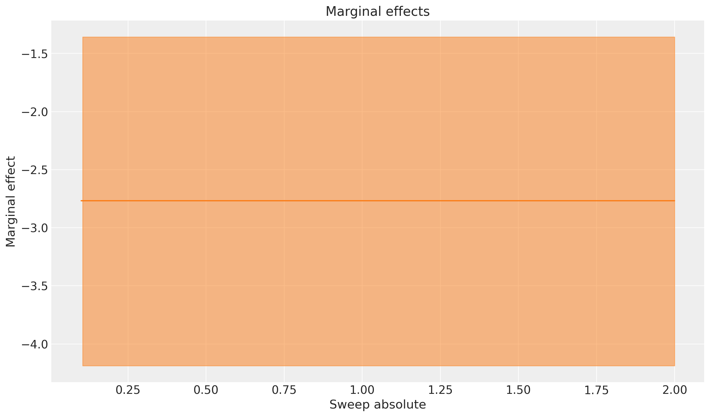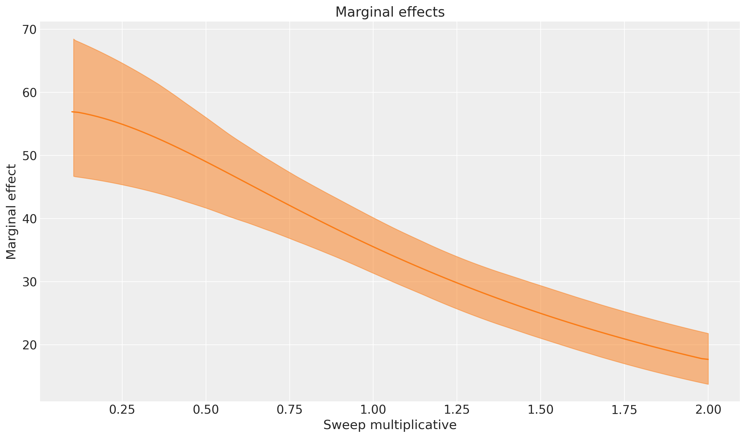 We can see that the highest marginal effects occur on the left side of the plot where we the influence spend is zero or very low. The highest incremental/marginal effects are obtained when we go from no spend to some spend. As we would expect from the previous plot, we still get incremental returns at the current spend levels (multiplicative change of 1.0), and are quite far away from totally saturating this channel - the marginal spend doesn’t reduce to near zero even if we consider a 2x increase in spend.
