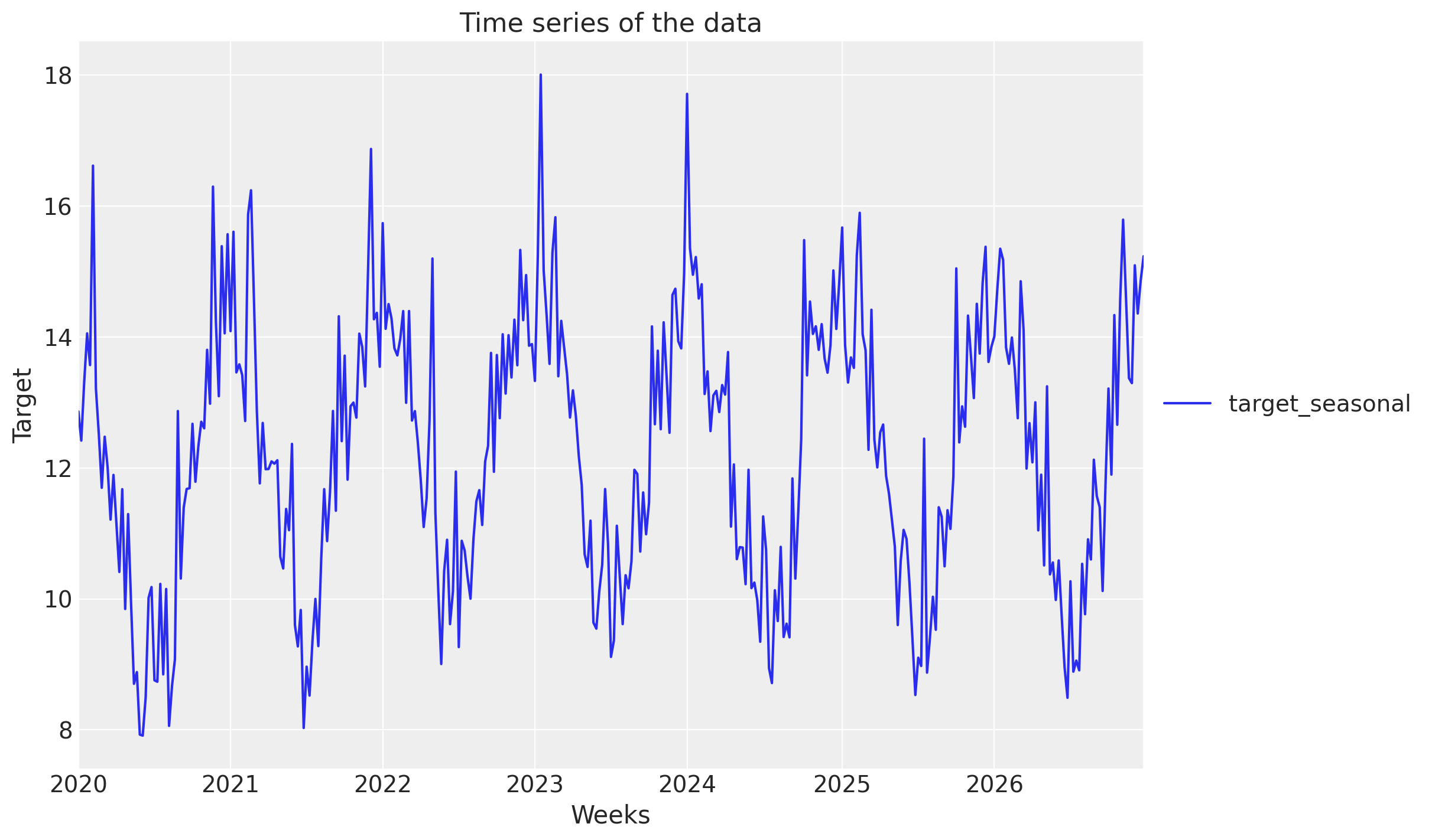 In classical marketing mix models, the effect of advertising (or other factors) on sales is assumed to be constant over time. Similarly, the baseline sales—what you would have sold without marketing—is also assumed to be constant. This is a simplification that typically doesn’t match reality. There will be times when, for various reasons, your ads are more effective, or when your product just sells better.