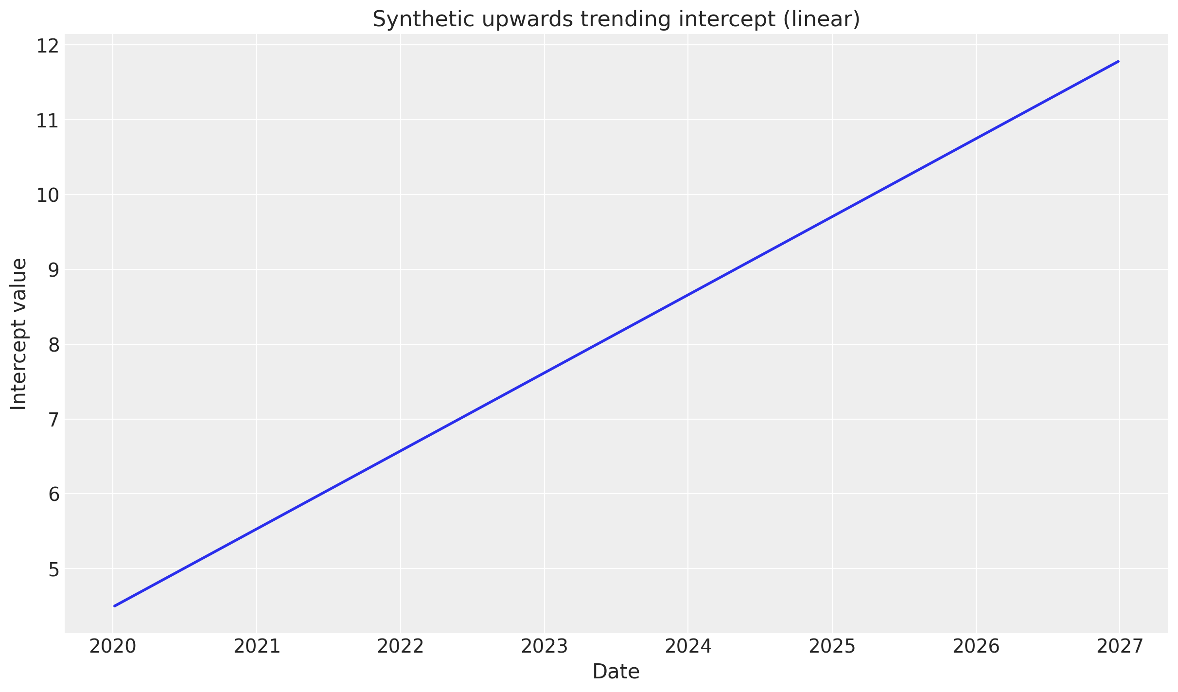 It’s quite clear from this example, that if you have a steep upward trend in your sales data that you have reason to expect will continue, you probably should not use a GP to model the intercept. Instead, you may use linearly increasing control variables.