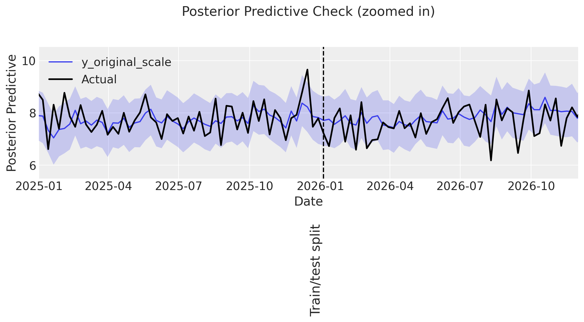 🤓 Under the hood, the time-varying intercept is modeled as a Gaussian Process (specifically a Hilbert Space GP to speed things up), constrained to \(\mu=1\) and then multiplied by a baseline intercept. So if the sampler infers that the baseline intercept is 1000 sunglasses sold per week, then the GP models the percentage deviation from that, over time. Have a look at the implementation of MMM for concrete structural details.