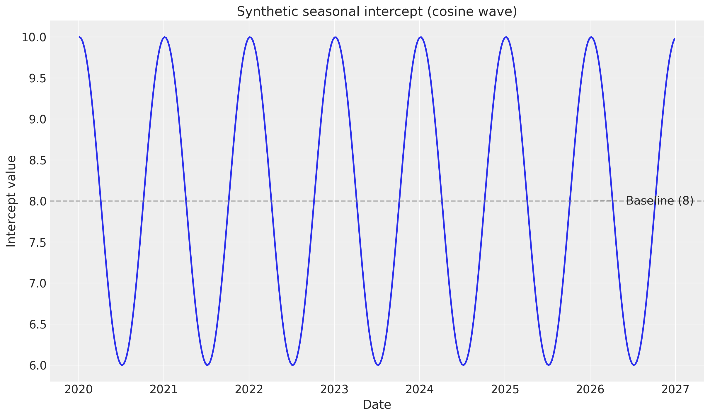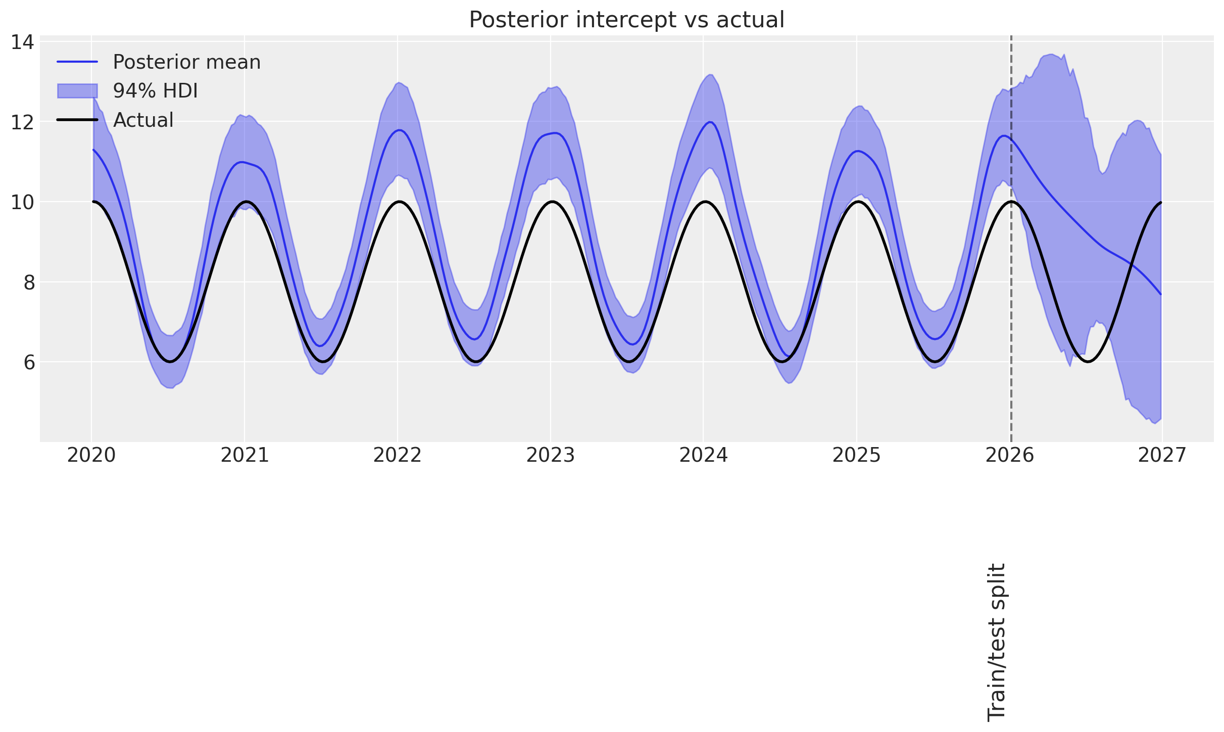Yearly seasonality: The intercept is a cosine function with a period of one year. Normally, one would use a Fourier basis to model seasonality, but let’s see what happens when we use a time-varying intercept 🤷♂️.