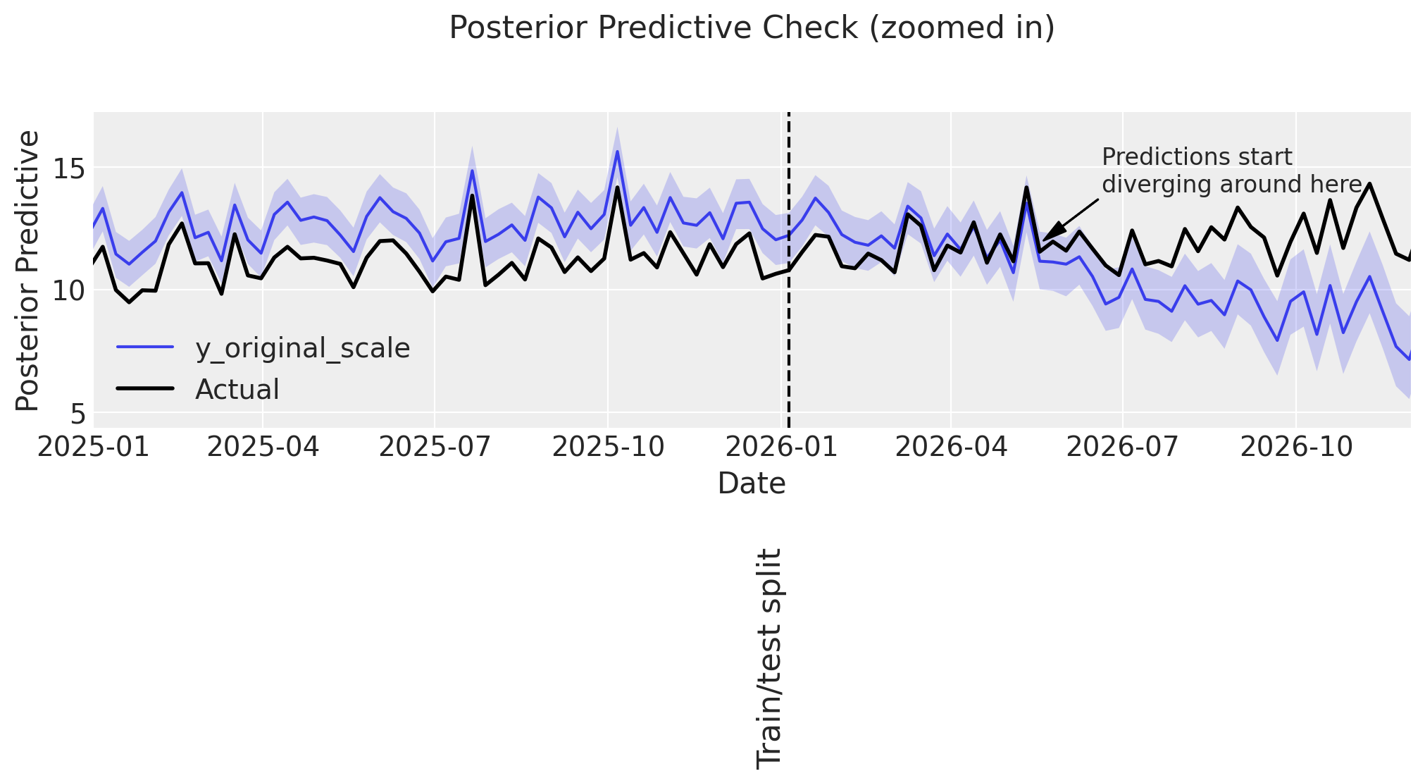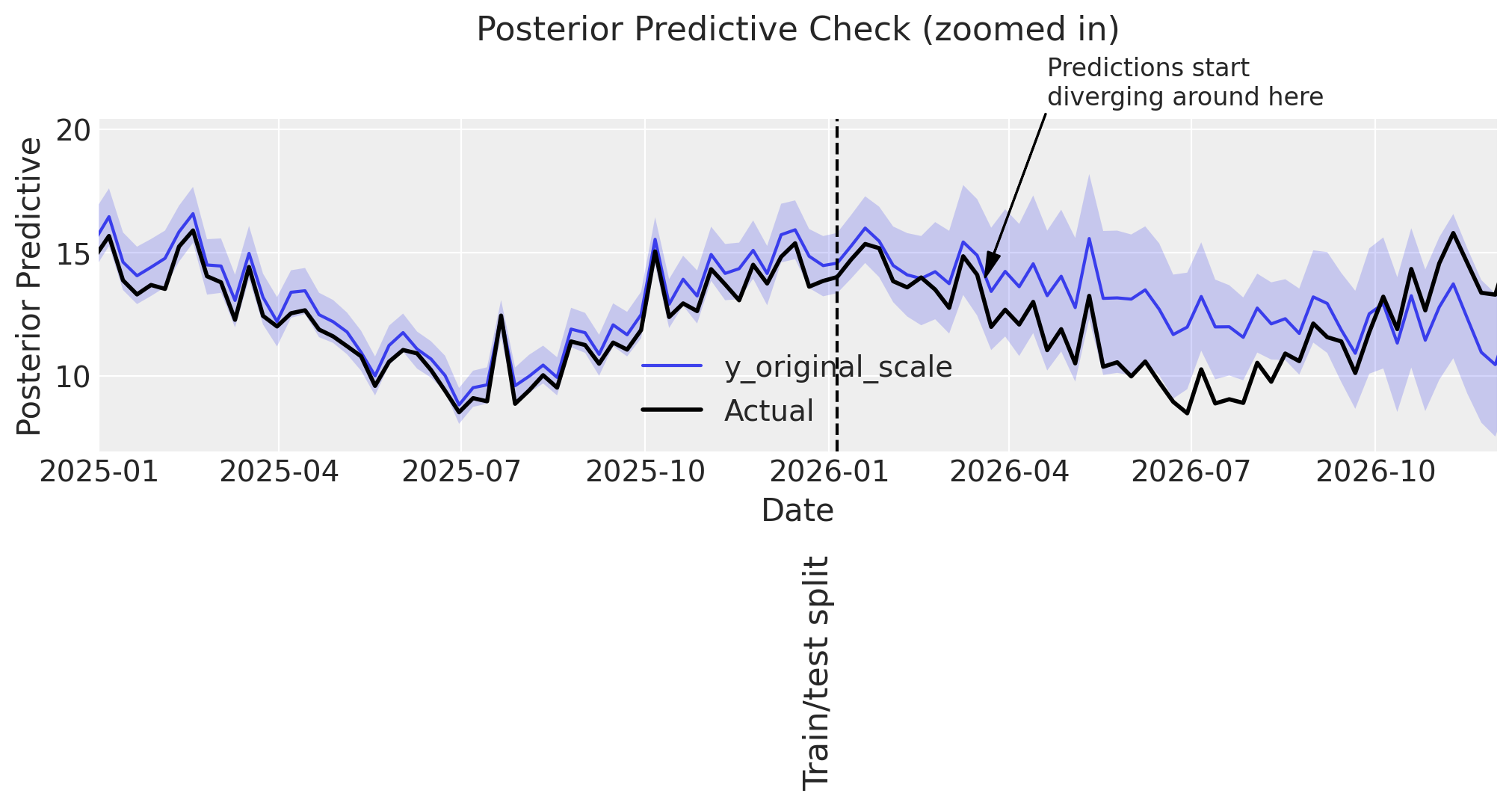 💡 Let’s try to refit the model with a shorter length scale prior mean of one year (52.18 weeks).