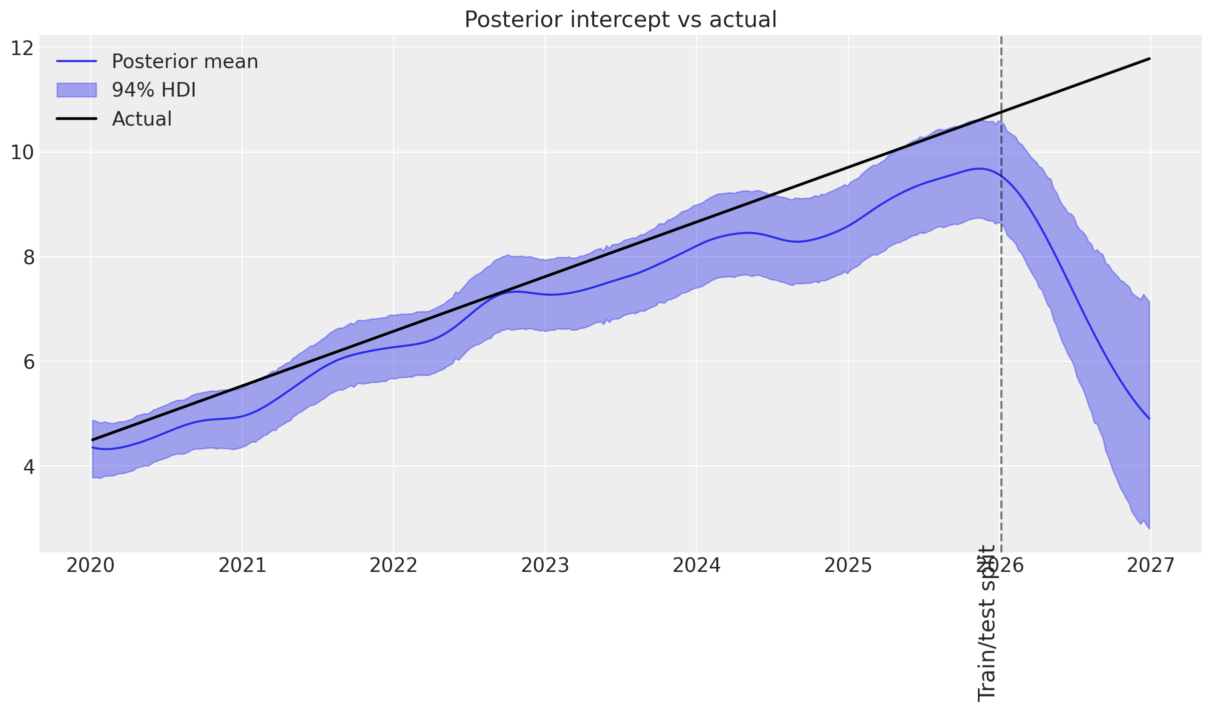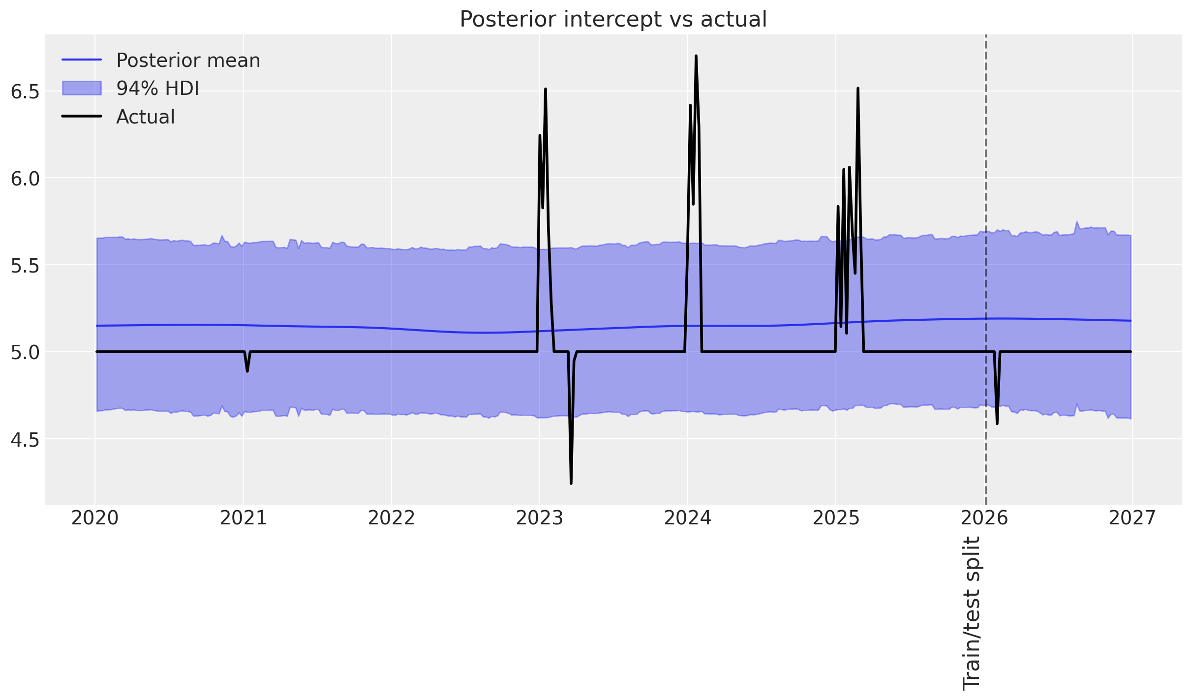 This is a strong indication that the time-varying intercept prior may not be well parameterized. Since the events that we synthesize happen on shorter time scales than the trends we modeled previously, it is likely that the mean of the length-scale prior is too high (default is two years).