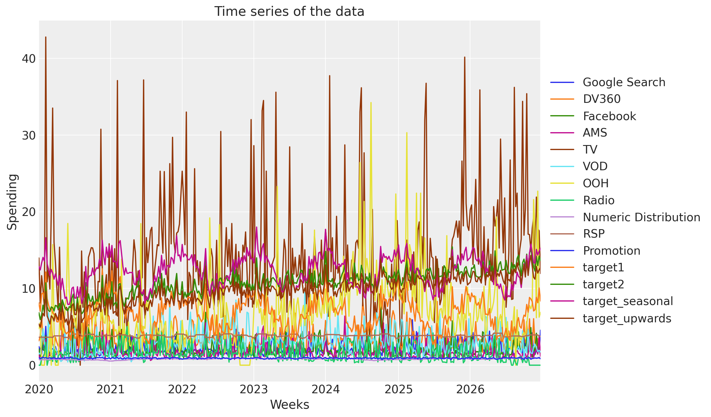 | Weeks | Google Search | DV360 | AMS | TV | VOD | OOH | Radio | Numeric Distribution | RSP | Promotion | target1 | target2 | target_seasonal | target_upwards | ||
