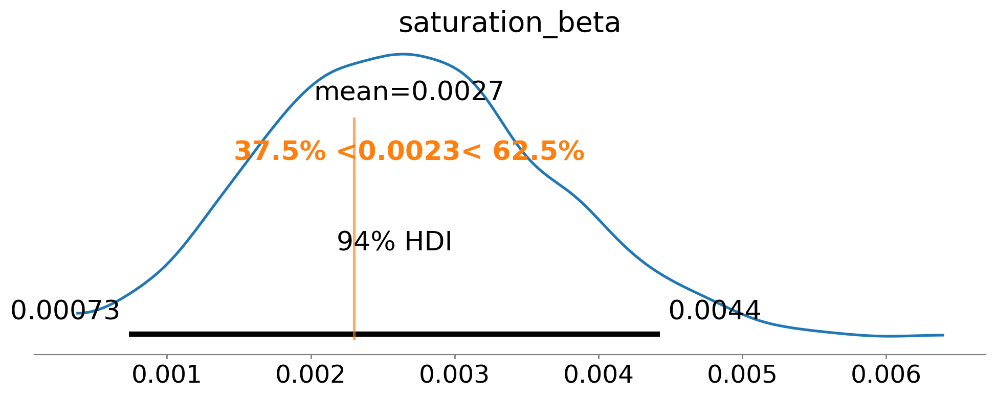 A PyMC-Marketing MMM with Geometric Adstock and Michaelis–Menten saturation for the outcome.
